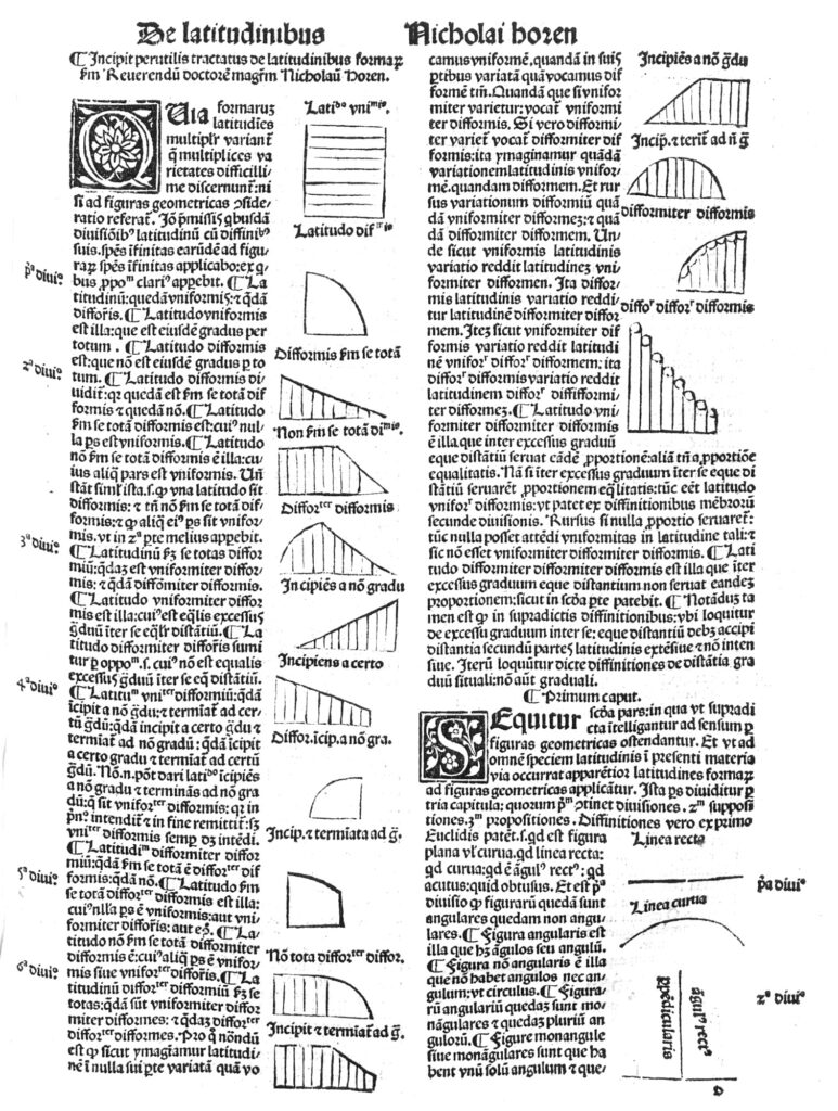O bispo francês Nicole Oresme (1323-1383) propôs em 1350, na obra “A Latitude das Formas”, a utilização de gráficos de barra (proto gráficos de barras que seriam aperfeiçoados por William Playfair no séc. XVIII) para demonstrar uma variável que depende de outro valor e, implicitamente, uma ideia de sistema coordenado