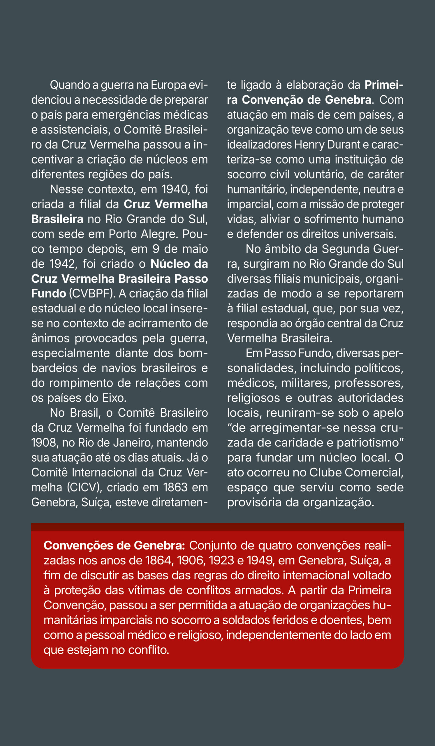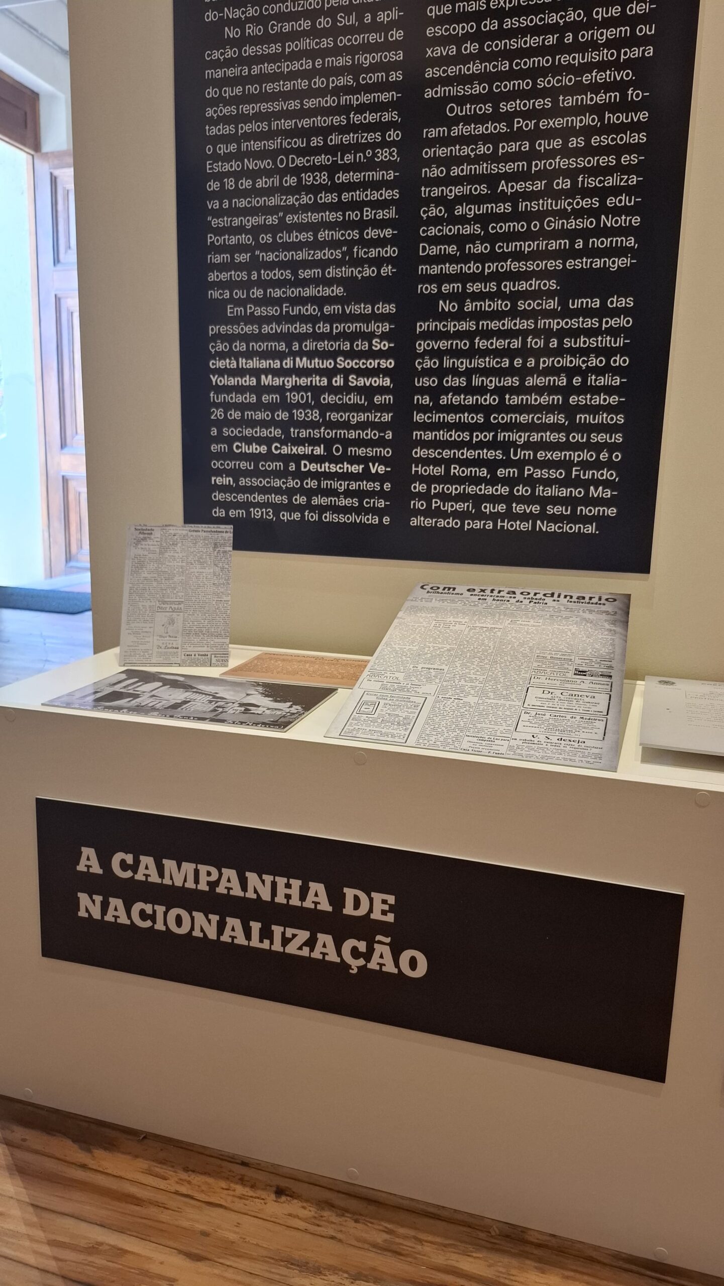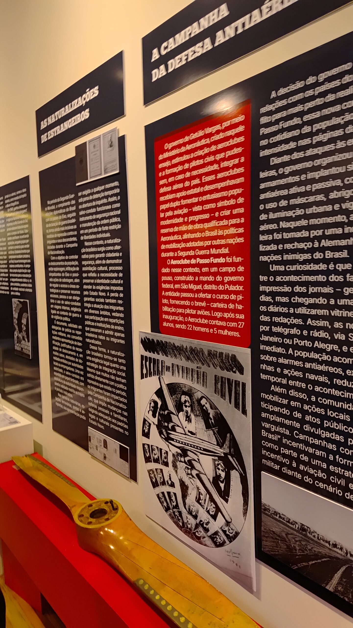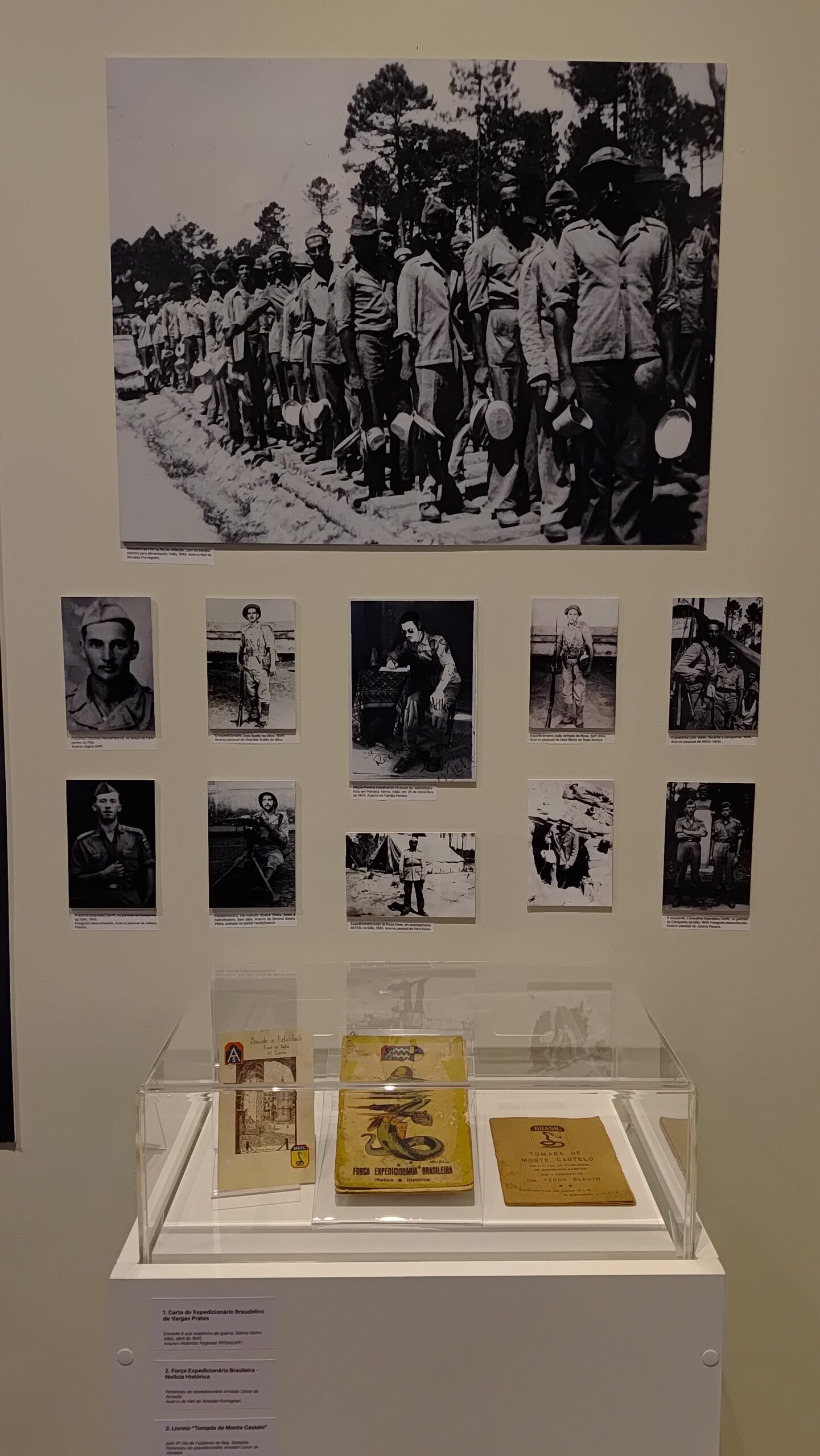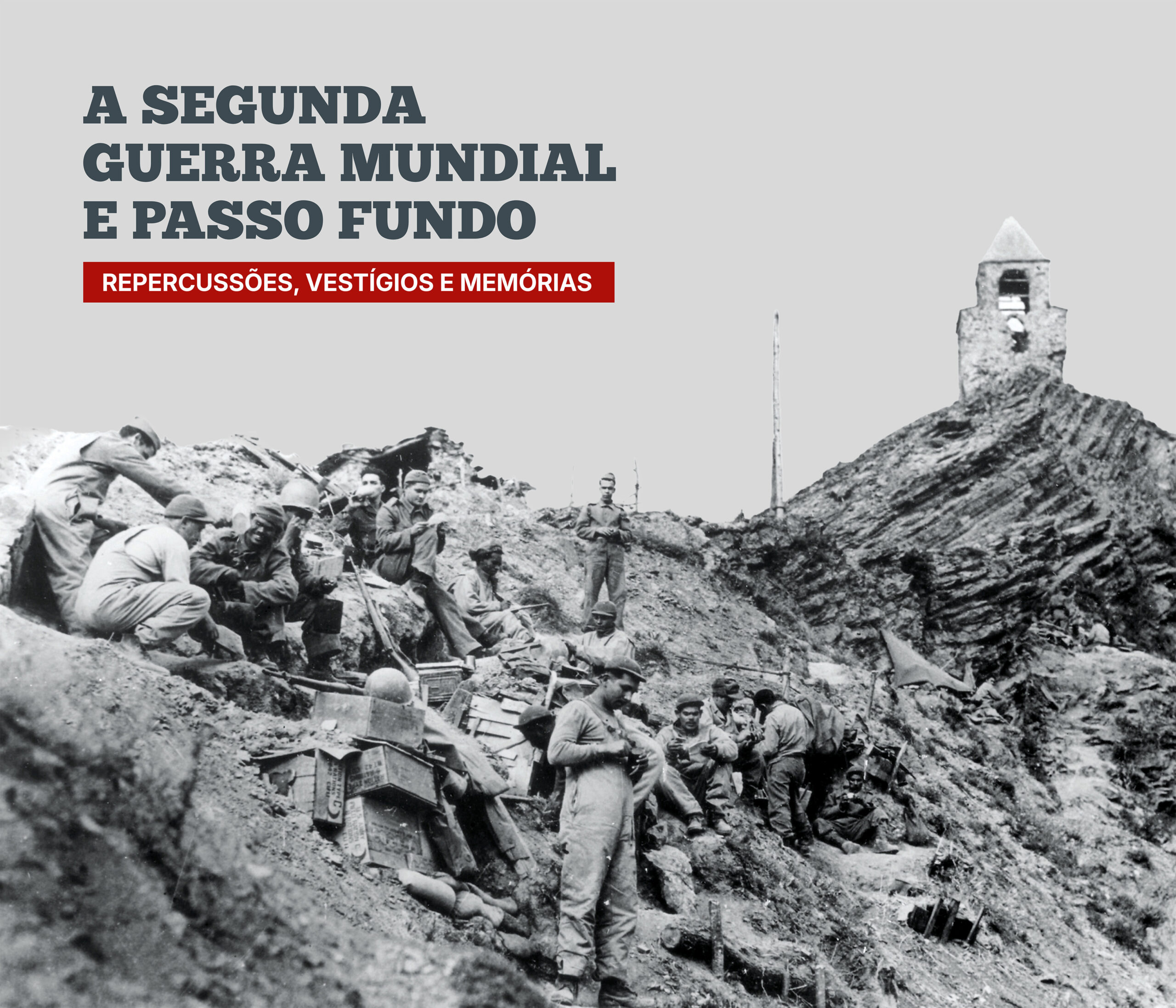 Projeto gráfico e programação visual da exposição “A Segunda Guerra Mundial e Passo Fundo”, realizada pelo Instituto Histórico de Passo Fundo. Painéis impressos com medidas principais de 70×120 cm, 130x120cm e 210x120cm, além de outras dimensões. Edição de aprox. 200 fotografias para impressão. Curadoria, pesquisa, produção, fotografias, objetos e textos pela equipe do IHPF.