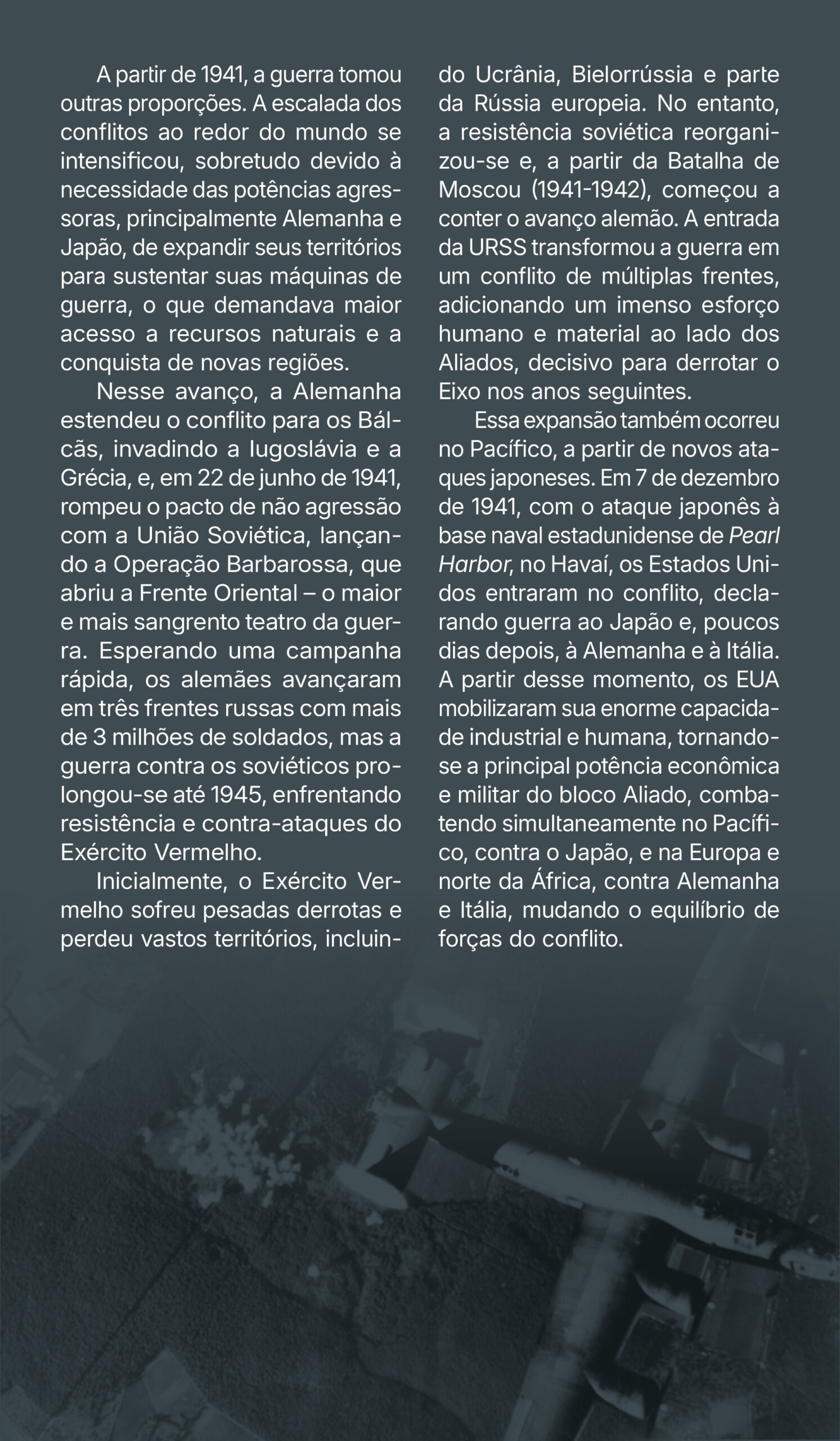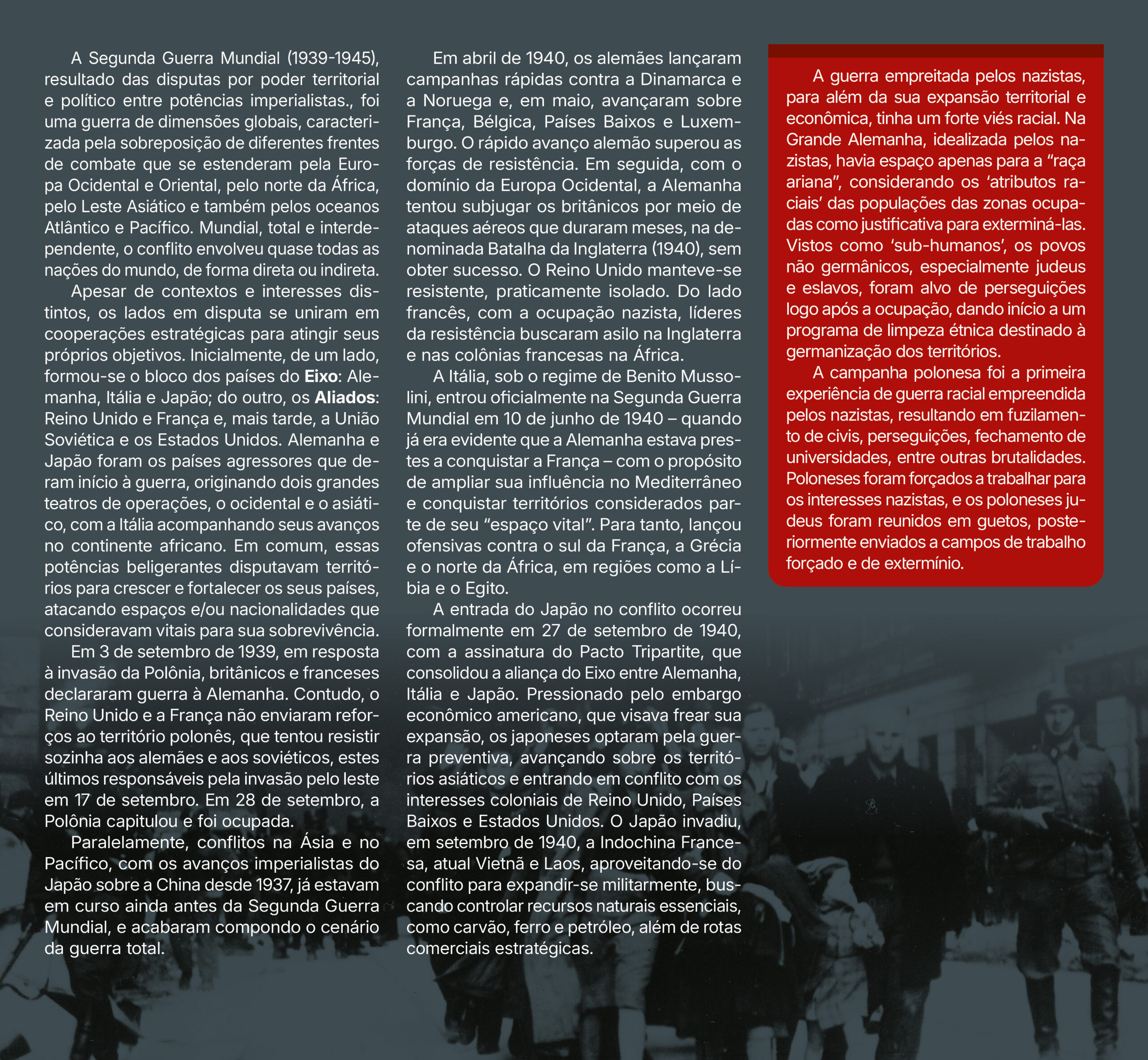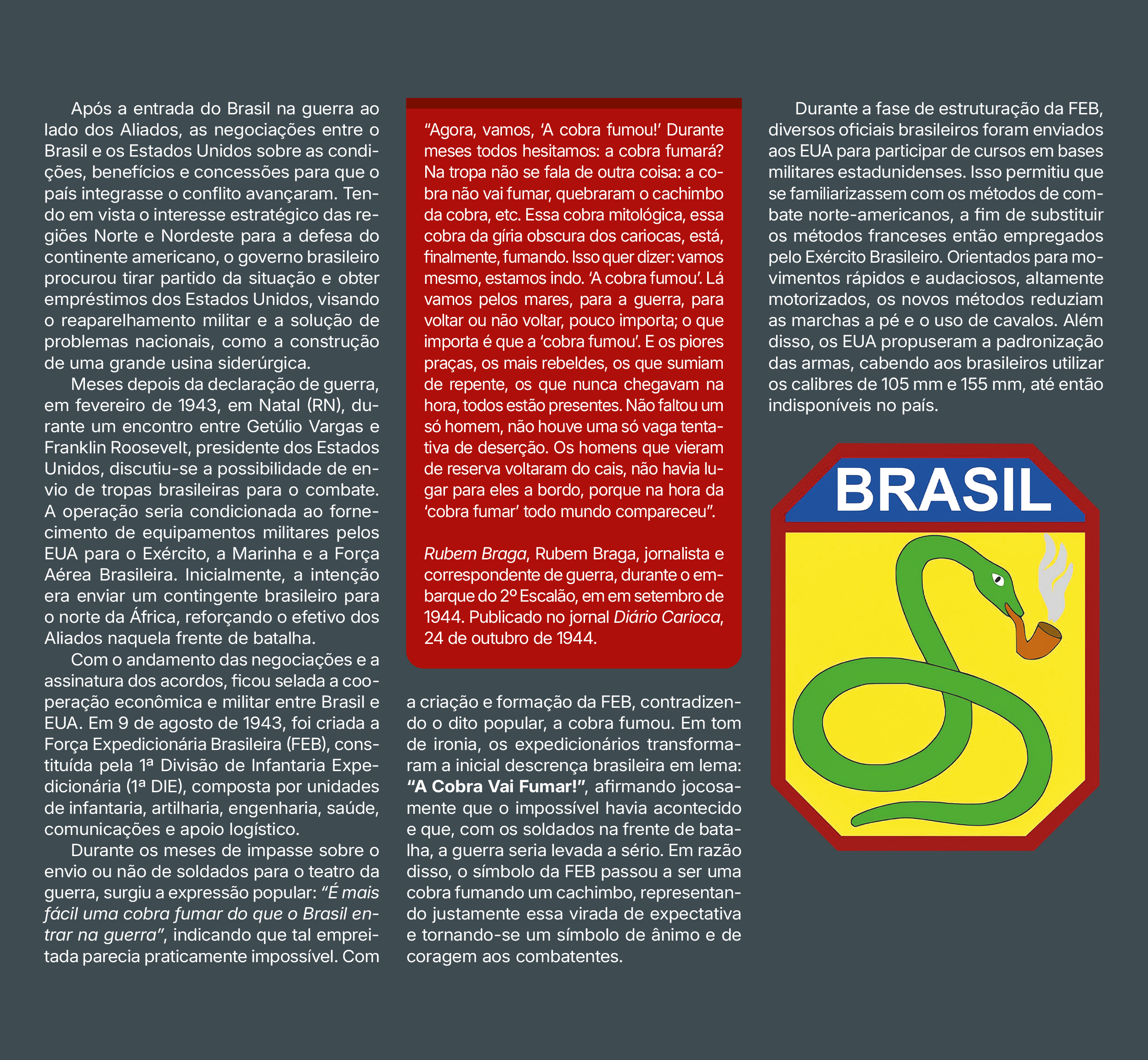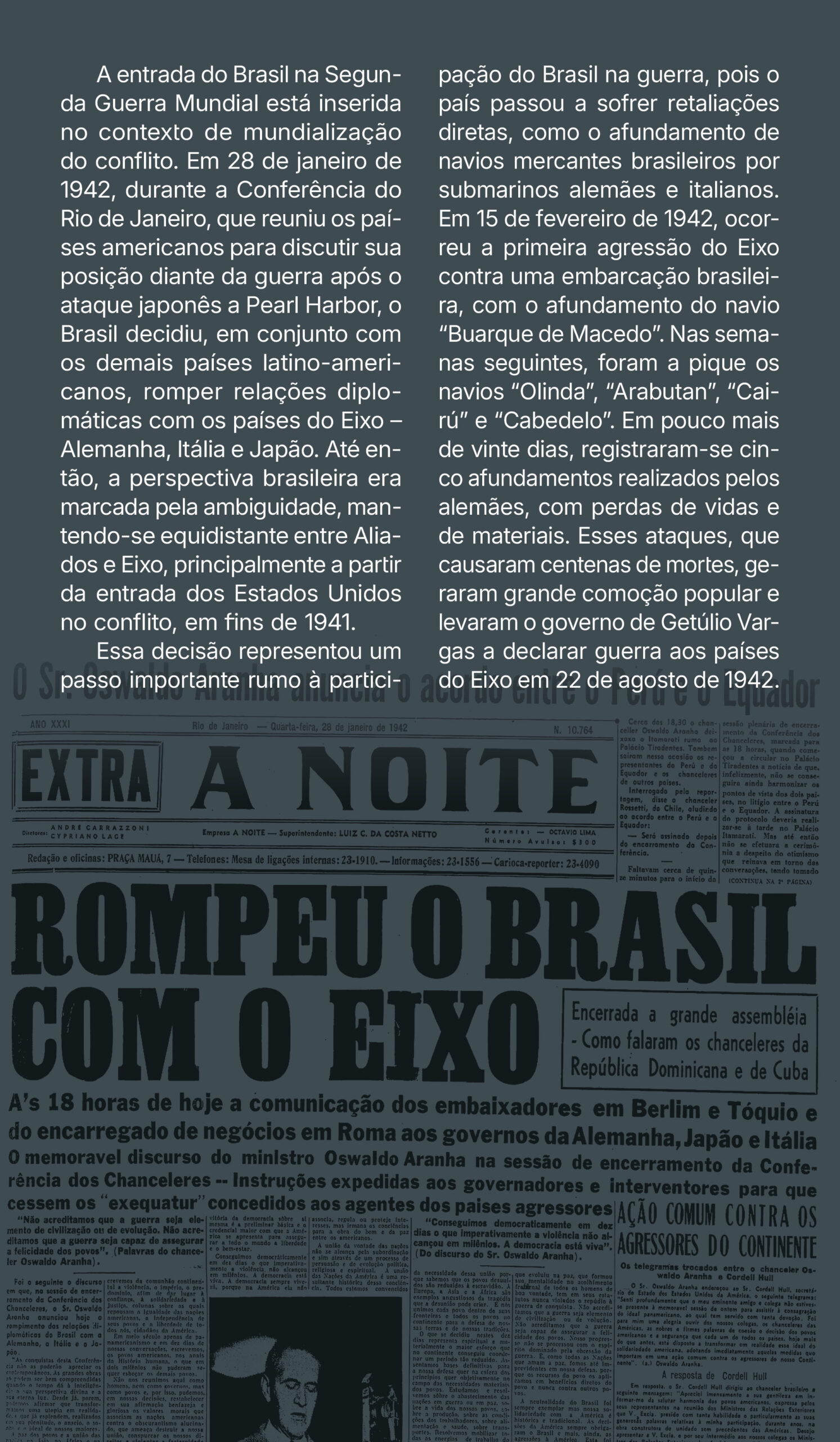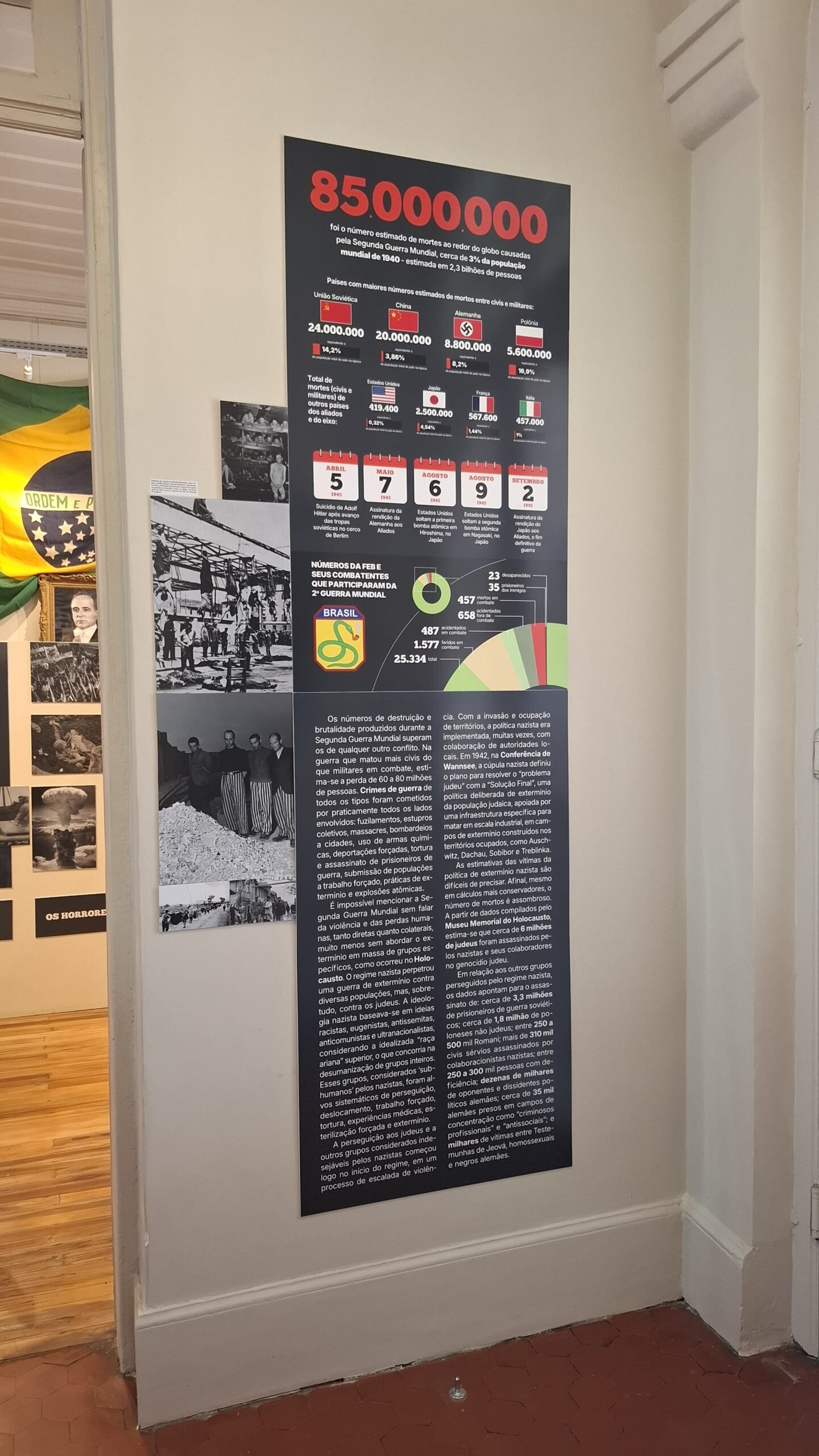 Projeto gráfico e programação visual da exposição “A Segunda Guerra Mundial e Passo Fundo”, realizada pelo Instituto Histórico de Passo Fundo. Painéis impressos com medidas principais de 70×120 cm, 130x120cm e 210x120cm, além de outras dimensões. Edição de aprox. 200 fotografias para impressão. Curadoria, pesquisa, produção, fotografias, objetos e textos pela equipe do IHPF.