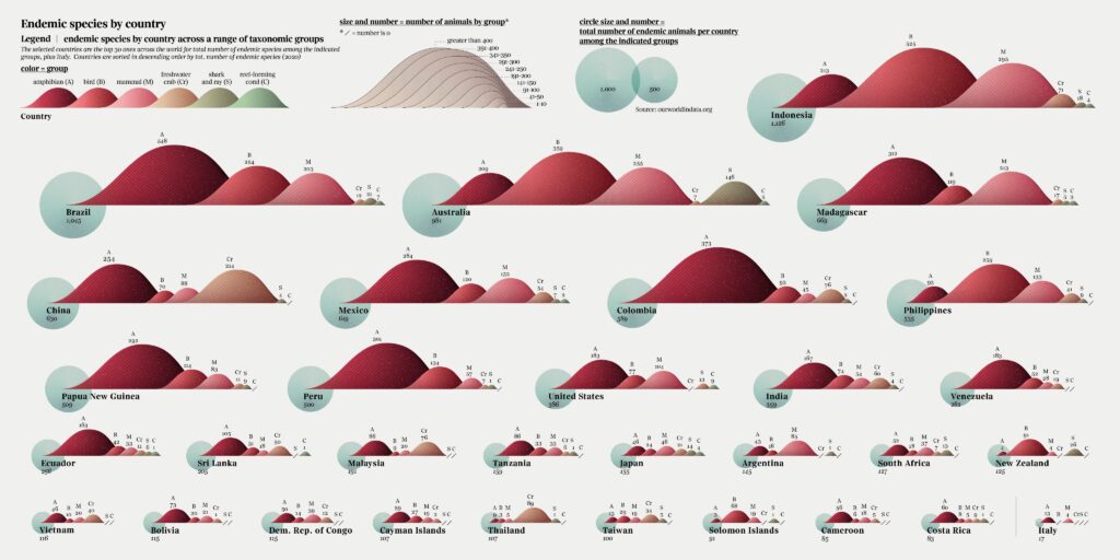 Mas ao mesmo tempo em que o foco da infografia é a precisão da informação, não quer dizer que o lado estético fica de lado – pelo contrário. Como exemplo de inspiração visual temos trabalhos fantásticos, como os do jornalista e artista Jaime Serra e da designer de informação Frederica Fragapane (a imagem destaca desta seção). Nomes renomados mundialmente, seus infográficos são peças de exposições em museus e chamam a atenção no primeiro olhar, que convidam o leitor para se aprofundar nas camadas.