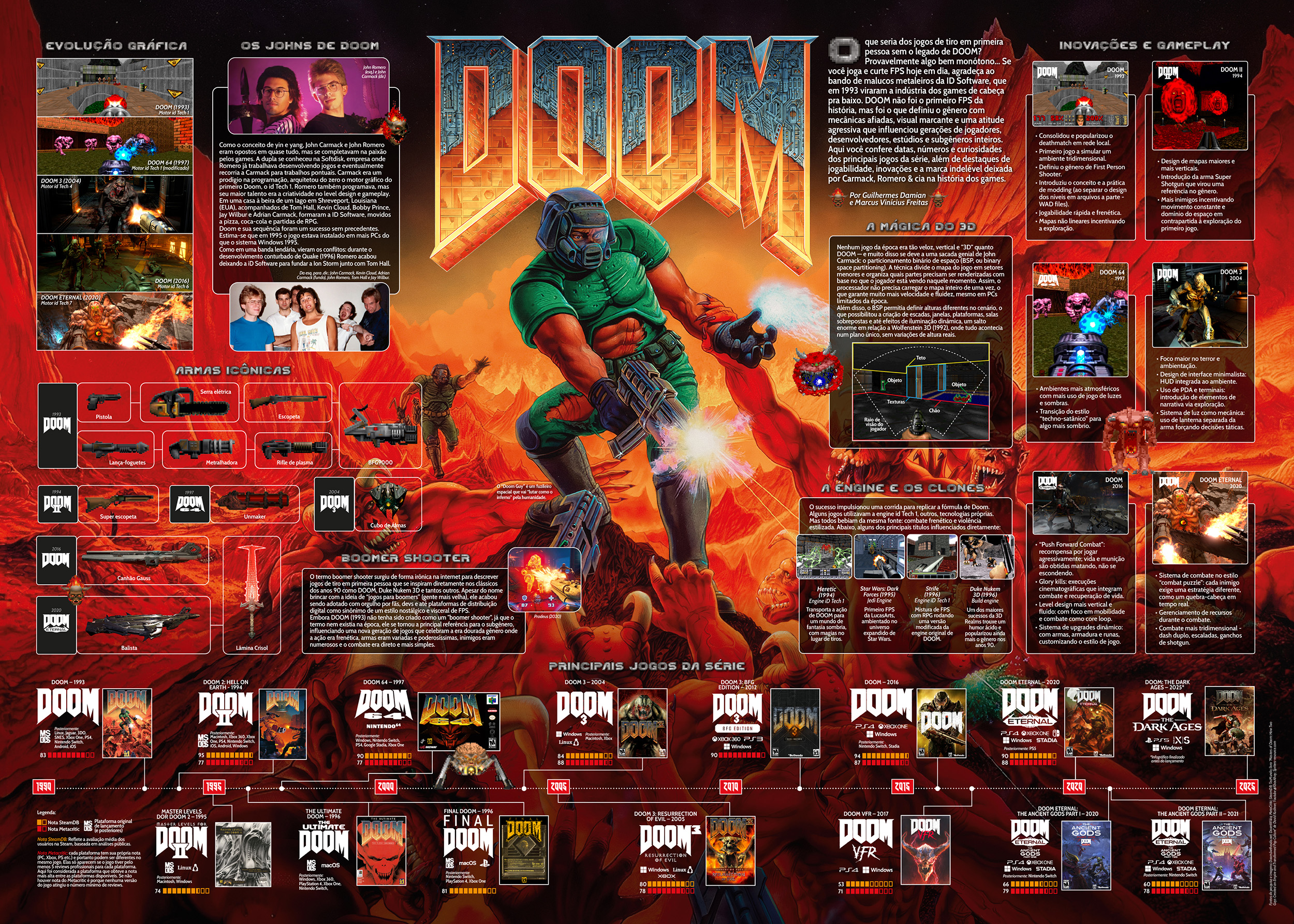 Infográfico sobre a série DOOM criado para o lançamento de DOOM: The Dark Ages, em maio de 2025. Conceito, produção, pesquisa, diagramação e edição em conjunto com Guilhermes (Guilhes) Damian. Produzido e editado no Adobe Illustrator, Corel Draw e Adobe Photoshop com medida de 50×70 cm.