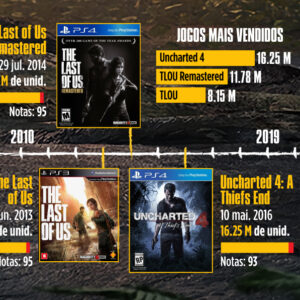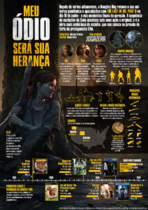 Infográfico sobre o jogo The Last of Us: Part II, disponível e publicado originalmente no site Jogazera.com.br. Produzido e editado no Adobe Illustrator e Adobe Photoshop no tamanho A3 (297x420mm). Com revisão de Renan Foca.