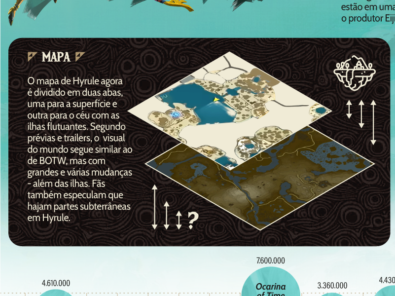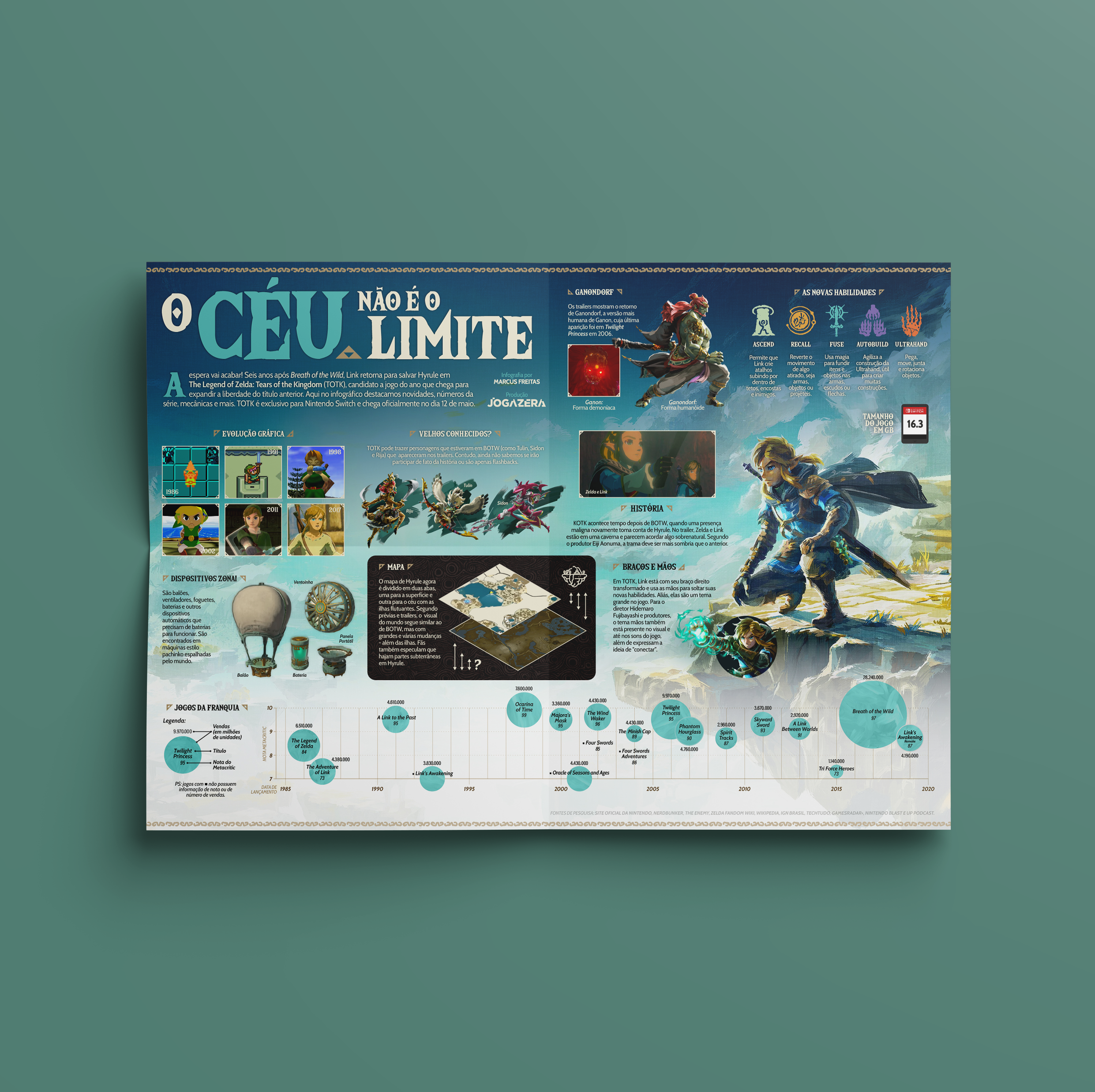 Infográfico sobre o jogo The Legend of Zelda: Tears of the Kingdom, publicado no dia 9 de maio de 2023 no site Jogazera. Produzido e editado no Adobe Illustrator no tamanho A3 (297x420mm).