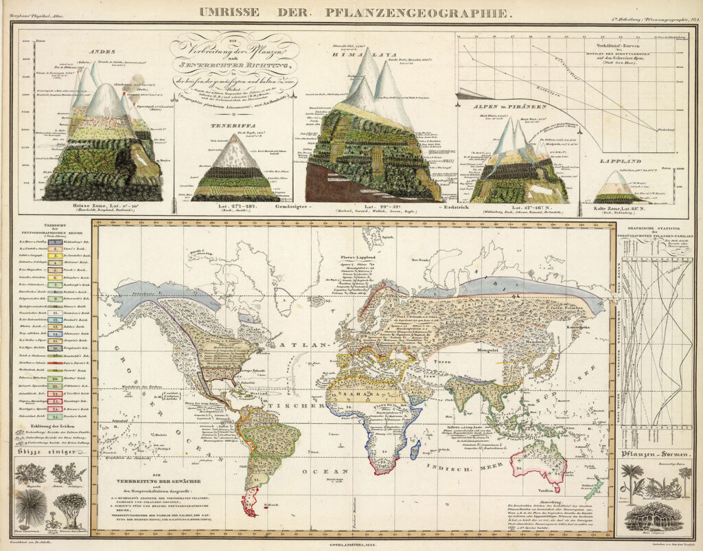 O geógrafo alemão Heinrich Karl Wilhelm Berghaus (1797-1884) fez um dos mais detalhados e extensivos atlas em “Atlas Físico” (Physikalischer Atlas), em 1848. Contando com a distribuição de plantas, animais e clima, além de tabelas e gráficos ilustrados, o trabalho de Berghaus é uma ilustração do “Kosmos”, um famoso tratado sobre ciência e natureza escrito pelo explorador alemão Alexander von Humboldt.