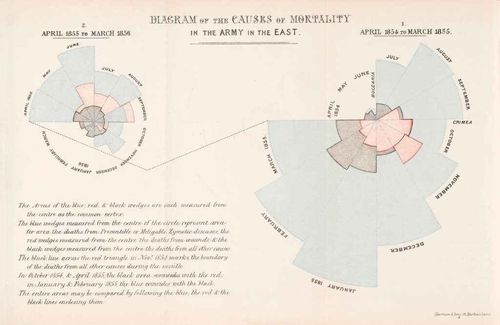Trabalhando como enfermeira na guerra da Criméia, ela presenciou as péssimas condições dos feridos. Com o intuito de melhorar condições sanitárias e, consequentemente, salvar vidas, Florence fez um relatório com vários “diagramas da rosa” (conhecidos como “coxcombs” em inglês) mostrando que muitos morriam por infecção hospitalar, e não pelos ferimentos de guerra. O apelo visual de seu trabalho mudou as diretrizes sanitárias e práticas relacionadas à saúde.
