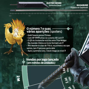 Infográfico sobre Final Fantasy VII Remake disponível e publicado originalmente no site de games Jogazera. Produzido e editado no Adobe Illustrator e Adobe Photoshop no tamanho A3 (297x420mm). Com textos de Chady Hammoud, Daniel Schettini e Luccas Augusto.